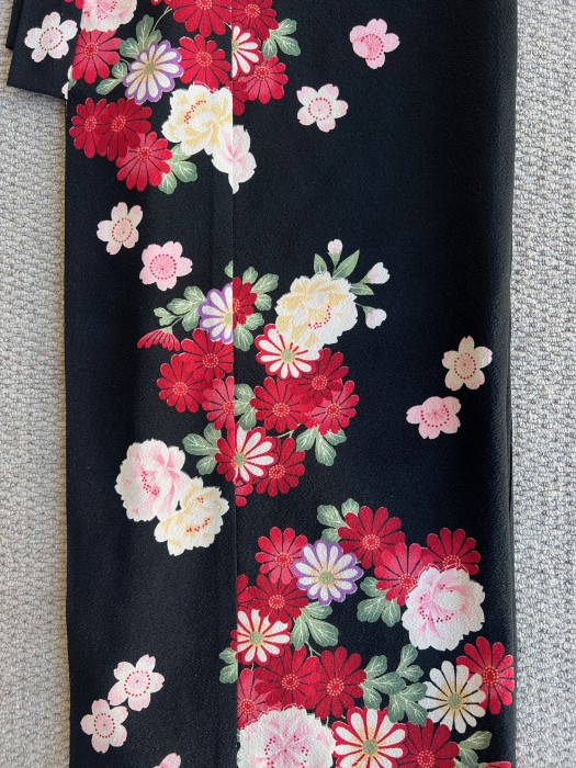 黒の縮緬生地に赤と白の花々がちりばめられたレトロモダンな一着。