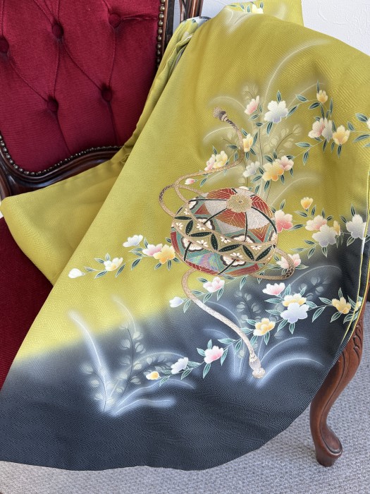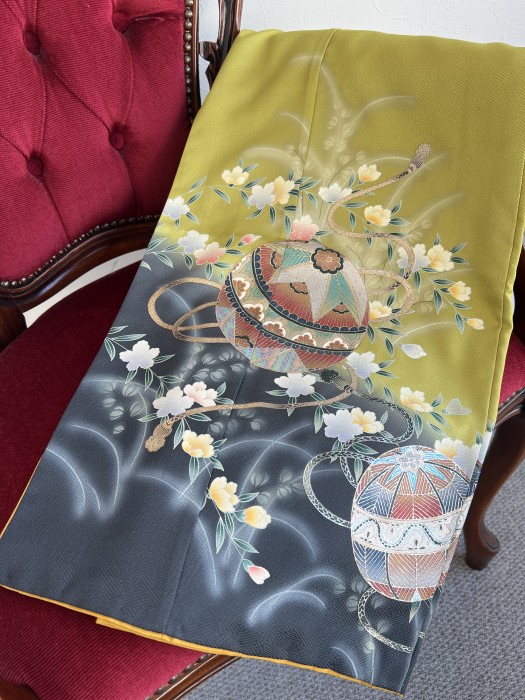 裾が黒の鶯色という大人びた色あいが素敵な一着です。