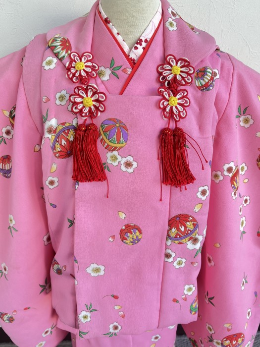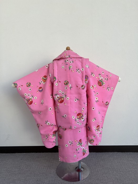 ピンクに鞠柄がかわいい三歳の七五三衣装