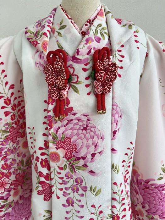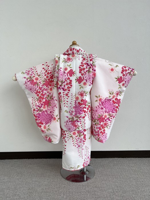 白地にパープル系の菊柄がぱっちりと映える一着です。