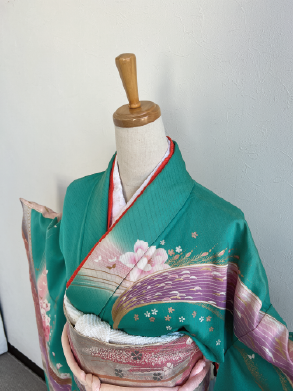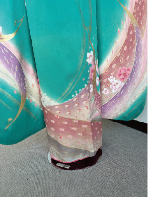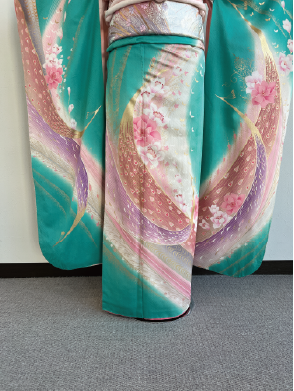 ブルーグリーンに孔雀の羽をピンク調で流れるように描かれたアンティーク振袖