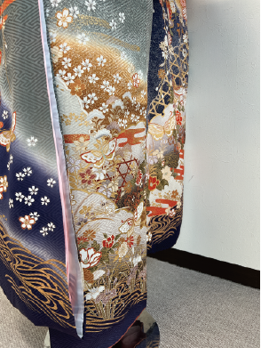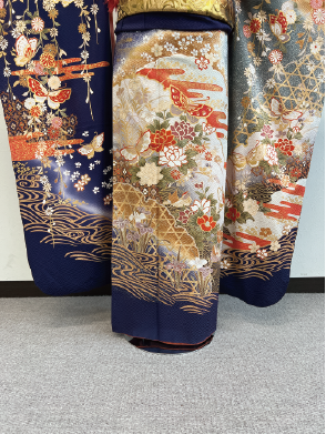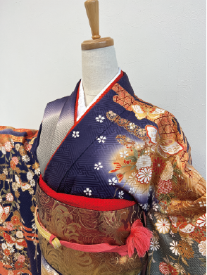 全体に描かれた様々な柄が輝く紺地のアンティーク振袖