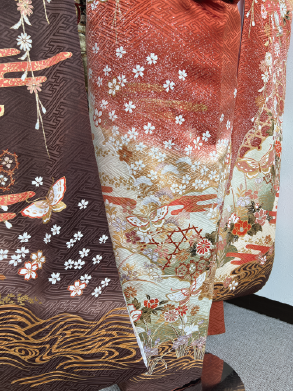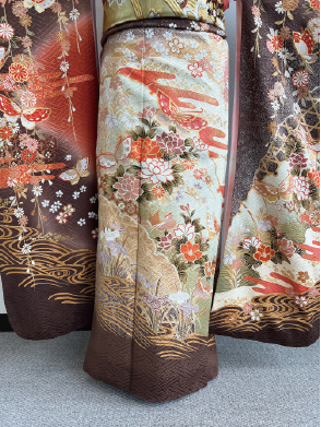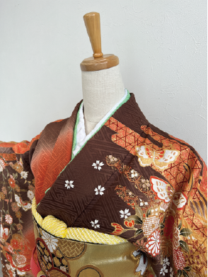 水仙、牡丹や蝶々などがふんだんに描かれた総柄のブラウン系アンティーク振袖