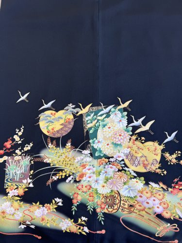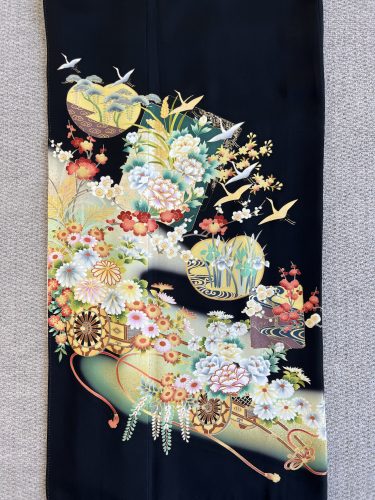 鶴や御車、そして藤などの花々が色鮮やかに描かれた黒留袖。