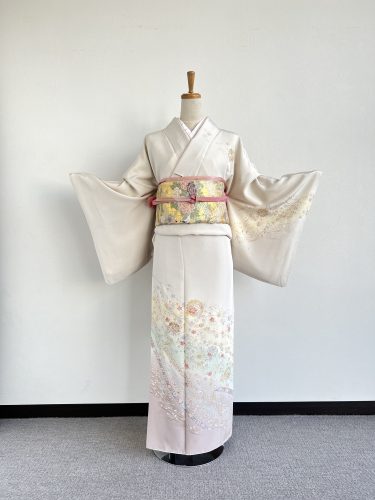 ほんのりとしたベージュの色合いが高尚な雰囲気の一着。