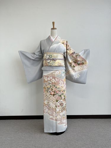 ブルーグレーという控えめながらも、品を感じる色合いが素敵な一着。