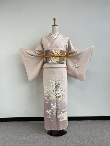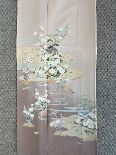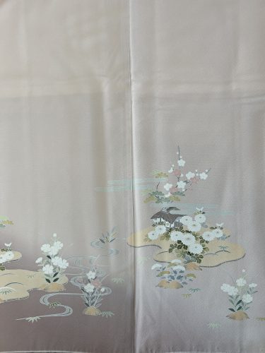 美しく描かれた白梅や白菊に品位を感じる一着。