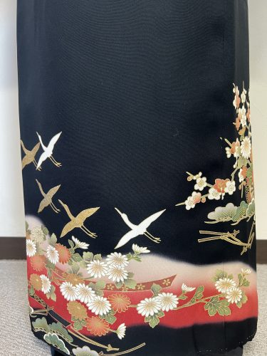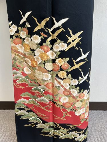 描かれた絵柄は鶴と松、そして菊のみに限定されることで、すっきりとした印象の一着です。