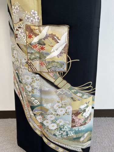 まるで張り付けたような鶴や梅、ボタンの絵柄が印象的です。