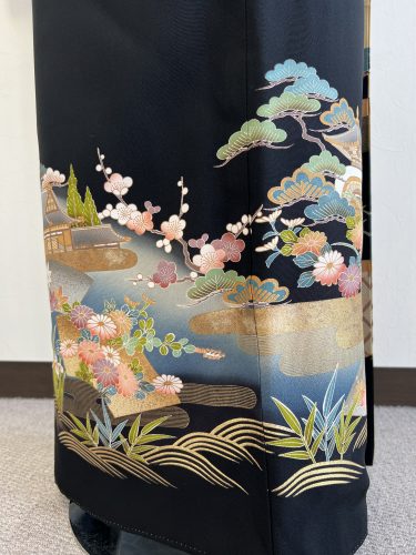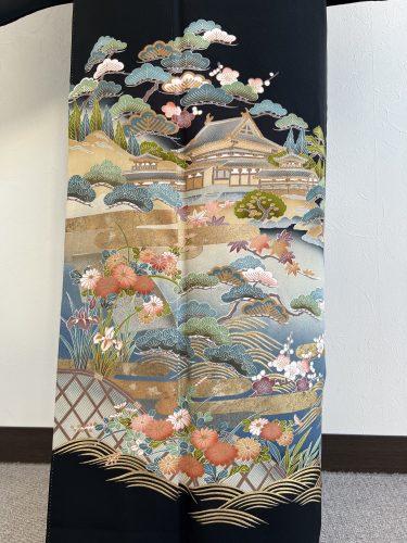 奥に佇む日本家屋を池から臨むように描かれた一着。ダイナミックに描かれ、池水の青がとても印象的です。その色合いから春から夏にかけての結婚式におすすめです。